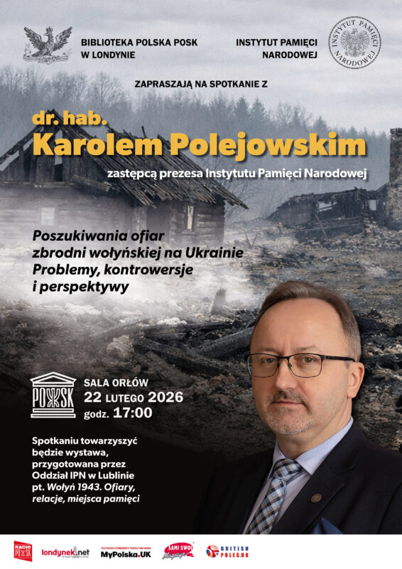 Biblioteka Polska POSK w Londynie zaprasza na spotkanie z dr. hab. Karolem Polejowskim, zastępcą prezesa Instytutu Pamięci Narodowej. Tematem wydarzenia będzie poszukiwanie ofiar zbrodni wołyńskiej...